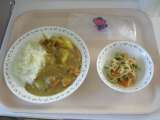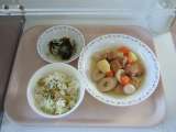 <献立> カレーライス 牛乳 福神漬 切り干し大根のサラダ お楽しみデザート <...