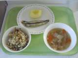 <献立> ひじきごはん 牛乳 のっぺい汁 焼きししゃも りんご <主な食材の産地...