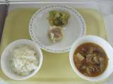 <献立> ごはん 牛乳 ジャンボしゅうまい 野菜の中華かけ 豆腐のチゲ風スープ ...