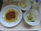 <献立> ○スパゲッティミートソース ○牛乳 ○ポテト入りフレンチサラダ ○くだ...