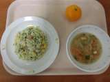 <献立> ○青菜のチャーハン ○牛乳 ○白菜と春雨スープ ○くだもの(みかん) ...