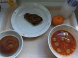 <献立> ○パエリア ○牛乳 ○キャベツスープ ○こんにゃくサラダ ○おからマフ...