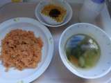 <献立> ○中華おこわ ○牛乳 ○中華風コーンスープ ○きゅうりとダイコンのごま...