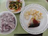 <献立> ○ごはん ○魚の西京焼き ○大根のゆかりかけ ○くきわかめのきんぴら ...