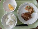 <献立> ○ごはん ○豆腐入りハンバーグ ○こんにゃくサラダ ○くだもの(いよか...