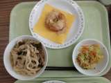 <献立> ○ソフトめん(けんちんじる) ○牛乳 ○いかとさつまいもの揚げ煮 ○く...