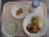〈献立〉 ○麦ごはん ○牛乳 ○豆腐入りハンバーグ ○ほうれんそうとコーンのソテ...