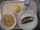 〈献立〉 ○ごはん ○牛乳 ○魚の七味焼き ○白菜のおかかかけ ○きざみこんぶの...