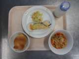 〈献立〉 ○ミルクパン ○牛乳 ○さけのガーリック焼き ○コーンサラダ ○ボルシ...