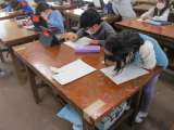 2組の授業は図工です。「へんてこ山の物語」と題して、いろいろな用具を使って、絵の...