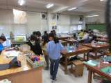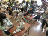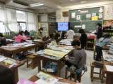 1年生の授業は図工です。身の回りにある新聞紙や色紙などのいろいろな種類の紙を手触...