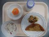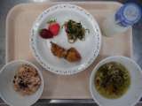 〈献立〉 ○赤飯 ○牛乳 ○鶏肉のからあげ ○菊花おひたし ○すまし汁 ○くだも...