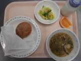 〈献立〉 ○あげパン ○牛乳 ○肉団子入り春雨スープ ○アスパラガスのサラダ ○...