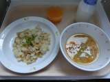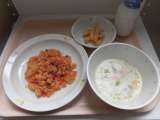 <献立> ○ソース焼きそば ○きゅうりの中華味 ○フルーツ白玉 ○牛乳 ...