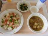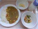 <献立> ○チキンカレーライス ○牛乳 ○こんにゃくサラダ ○くだもの(りんご)...
