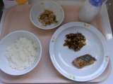 <献立> ○ごはん ○牛乳 ○魚の西京焼き ○ごま酢かけ ○きざみこんぶの五目煮...