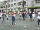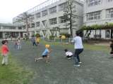 今日の朝の活動は朝遊びです。 子どもたちが校庭で走り回っています。先生も一緒に走...