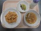 〈献立〉 ○きつねうどん ○牛乳 ○かきあげ ○野菜のごまみそかけ ○くだもの(...