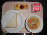 〈献立〉 ○マーマレードバターサンド ○牛乳 ○白いんげんの田舎風スープ ○スペ...