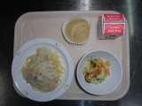 〈献立〉 ○スパゲッティクリームソース ○牛乳 ○野菜のレモンじょうゆかけ ○黒...
