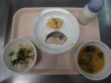 〈献立〉 ○大豆とじゃこのごはん ○牛乳 ○魚の梅肉焼き ○野菜の甘酢かけ ○味...
