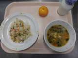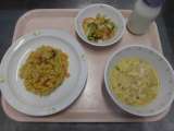 〈献立〉 ○カレーピラフ ○牛乳 ○パリパリサラダ ○卵とトマトのスープ 〈主...