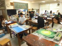 6年生の授業は図工です。子どもたちは画用紙に水彩絵の具のいろいろな色を使ってグラ...