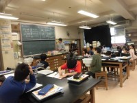 4年生の授業は理科です。鉄の体積の変化について実験をしています。鉄球の体積が熱す...