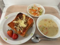 献立 ツナピザトースト コーンクリームチャウダー ハニーレモンドレッシングのサラ...