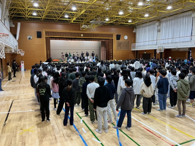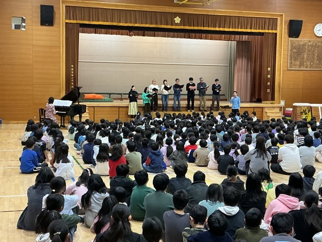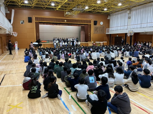 今日の音楽朝会は、本校合唱団、PTAコーラス「さくら*ころん」さんの発表を聞きました。