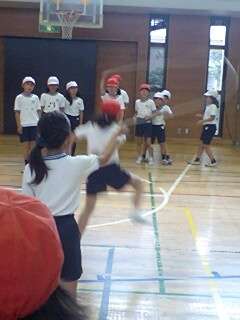 体育館で、4年生の3クラスで合同体育を行いました。クラスごとの長なわ。どのクラスも、みんなで励まし合いながら、楽しく跳びました。