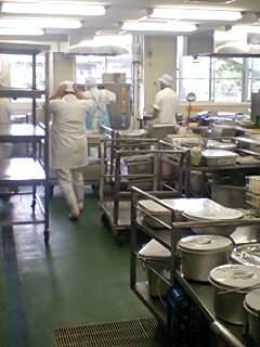11時半から12時までの、調理主事は大忙しです。それぞれのクラスのワゴン車に給食を分けて乗せ、リフトで各階に運びます。子どもたちにできたての温かい給食を届けるために、腰の痛みも何のその、一生懸命積み込みます。