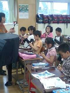 先生のお手本のあと、全員でタンギングの練習です。先生が一人一人の音を確認しながら、指導しています。