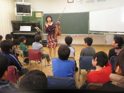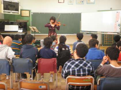つくし学級では音楽の時間にバイオリンのコンサートをやっていました。バイオリンのきれいな音色を子どもたちは真剣に聴いていました。