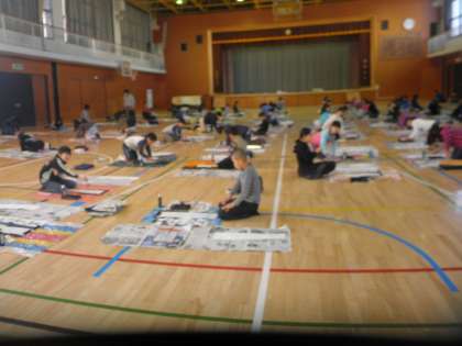 4年生が、学年合同で体育館で書き初めをしています。みんな静かに気持ちを集中して書いています。