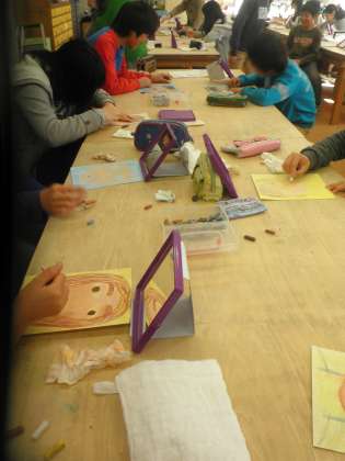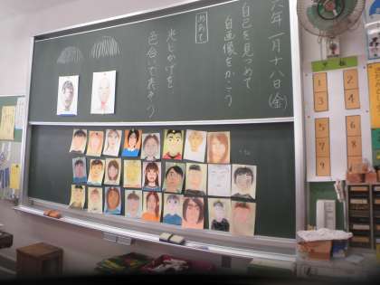 6年生は、「自己を見つめて 自画像を描こう」という授業をしています。自分をしっかり見て自画像をパステルで描いています。みんな真剣に自分の特徴を見つけて自画像を描いています。この絵は卒業式にも飾られる予定です。