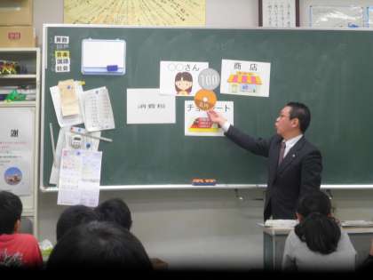 子どもたちにわかりやすいよう、消費税を中心に税金のことをわかりやすく教えていただき、大変わかりやすくておもしろい授業でした。