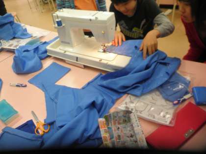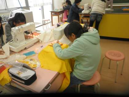 5年生が家庭科の授業でエプロンを縫っていました。ミシンを使って製作中です。ミシンに集中している様子がうかがわれます。みんな、一生懸命に取り組んでいます。