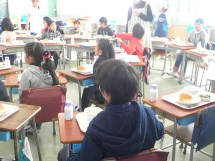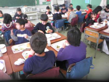 今日は、交流給食でした。高学年が低学年給食の準備をして、1年生から6年生までの縦割りで給食を食べます。班によって、小さなグループで食べたり、大きな輪になって食べたりと色々です。みんな楽しそうに食べていました。