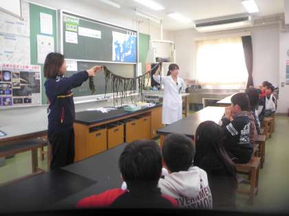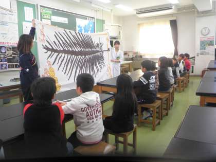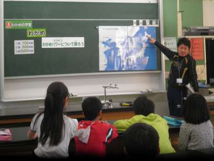 今日は3年生が理研ビタミン(株)にゲストティチャーとして来ていただいて、わかめの学習をしました。わかめの本当の大きさや、わかめの栄養について教わりました。