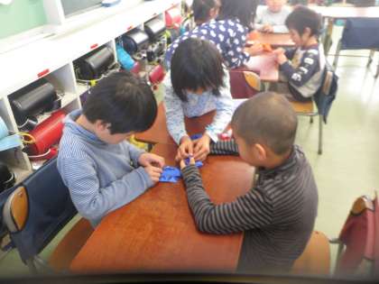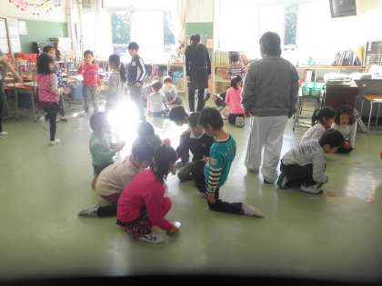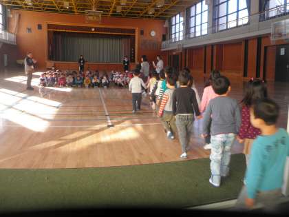 1年生と上祖師谷保育園の交流会がありました。1年生は昔遊び(めんこ、コマ、おはじきあ)や折り紙、輪投げなどいろいろな遊びを保育園の子どもたちと一緒に遊んでいます。折り紙などは丁寧に教えている様子もうかがえました。楽しい時間が過ごせました。