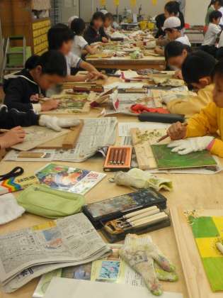 4年生は、初めての木版画に挑戦しています。彫刻等を使うのも初めてです。みんな真剣に作業をしている様子がうかがえます。
