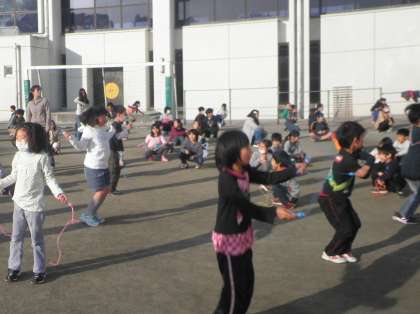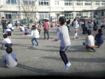 今朝は、縄跳び集会でした。いま取り組んでいる縄跳旬間で学んだ技に挑戦したり、難しい技をやっている様子を見たりしました。