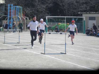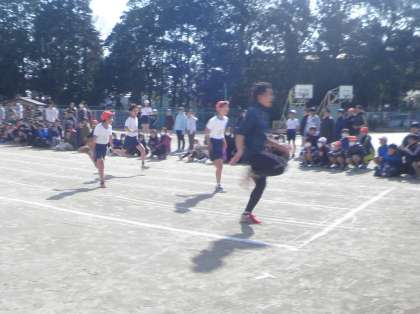 6年生50mアスリート55mの対決、6年生が50m、アスリートは50mハードルの対決、ボウテックス投げの対決などを行いました。