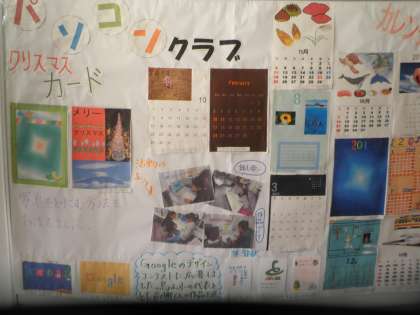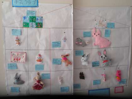 クラブ発表は、みんなの前で発表するだけでなく、第三昇降口に掲示発表をしているクラブもあります。手芸クラブ、パソコンクラブ、ゲーム遊びクラブは、作品などを工夫して掲示しています。