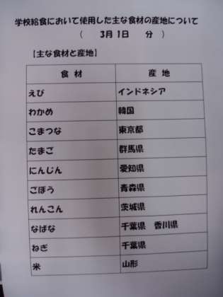 3/1 今日の給食の食材の産地
