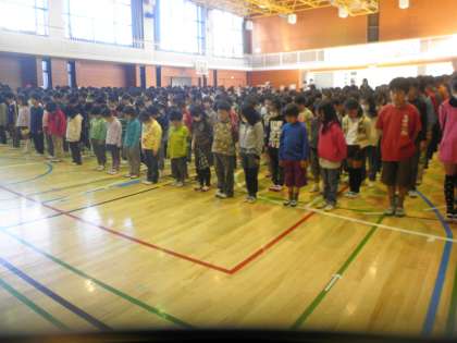 今日は、全校朝会で校長先生が3・11のお話をされました。亡くなった方たちへ哀悼の意味を込めて、全校で黙とうをしました。本当は2時46分にしますが、1年から3年生が授業がないので、朝全校でやりました。みんな真剣な態度で黙とうをしていました。