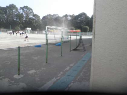 暖かいけれど風が強く、スプリンクラーをまいても、校庭は砂埃が舞っています。それでも子どもたちは元気に体育に取り組んでいます。