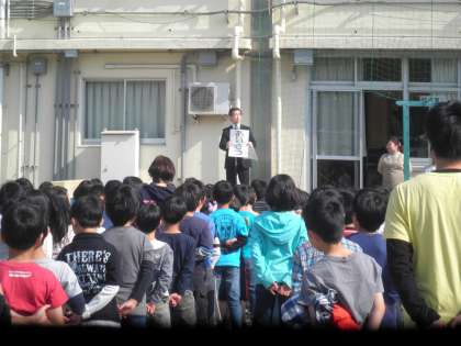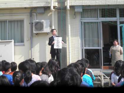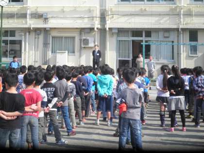 毎週月曜日は全校朝会です。みんないい姿勢でお話を聞いています。今朝の後藤校長先生のお話は、「あいさつをしっかりしよう」「ともだちを大切にしよう」でした。