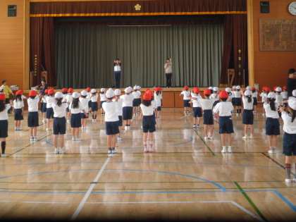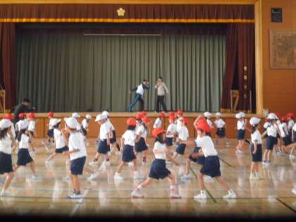 1年生が体育館でダンス練習をしていました。先生のお話をよく聞いて、難しい動きなのに、ほとんどの子が動きを真似することができていました。みんなよくお話を聞いて頑張っていました。